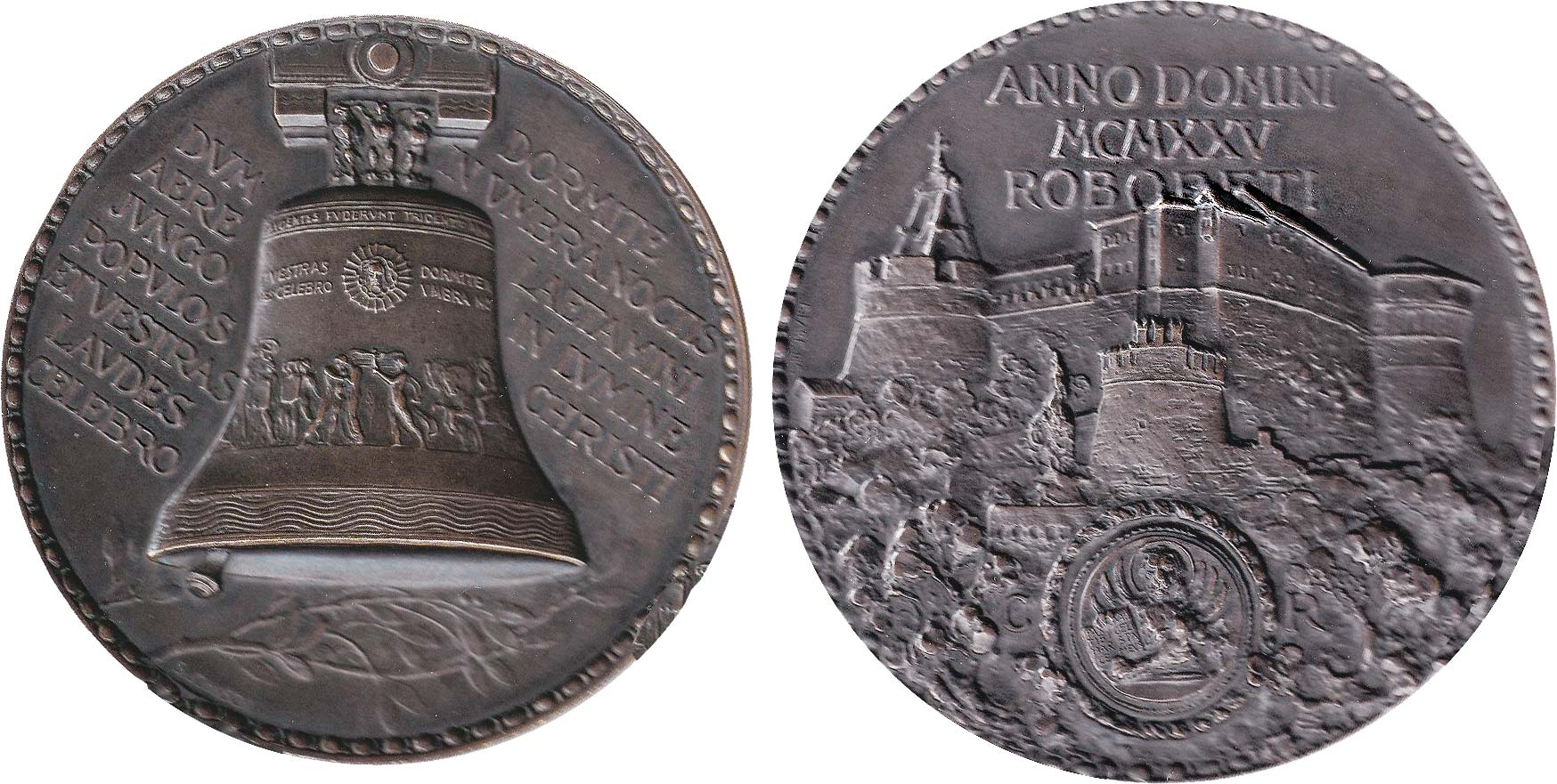 Prima medaglia dedicata alla Campana dei Caduti “Maria Dolens”, anno 1925. D/ Bella vista della Campana con bassorilievi e scritte in latino, in basso rami d’ulivo, a sinistra Johnson R/ Il castello e il bastione Malipero sul “castello” in legno che sostiene la prima campana, in centro su tre righe ANNO DOMINI – MCMXXV – ROBORETI; sotto leone di San Marco con ai lati C.R. (Comune Rovereto). Metallo: bronzo. Diametro 80 mm.